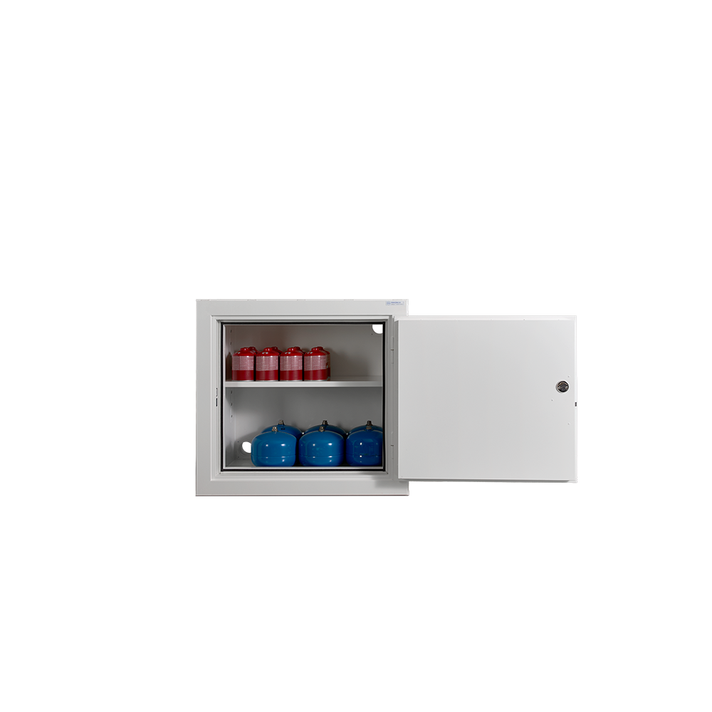 Avskiljande Gas och Gasolskåp Ei30 är utrustade med ventilationsanslutningar som ventileras direkt ut genom yttervägg utan mekanisk ventilation. 2 st. rörstoser (ILÖ 80) är placerade på skåpets rygg, en i överkant och en i nederkant. Som standard levereras skåpen med högerhängd dörr och ventilation genom rygg. Hyllorna klarar 70 kg jämn belastning.