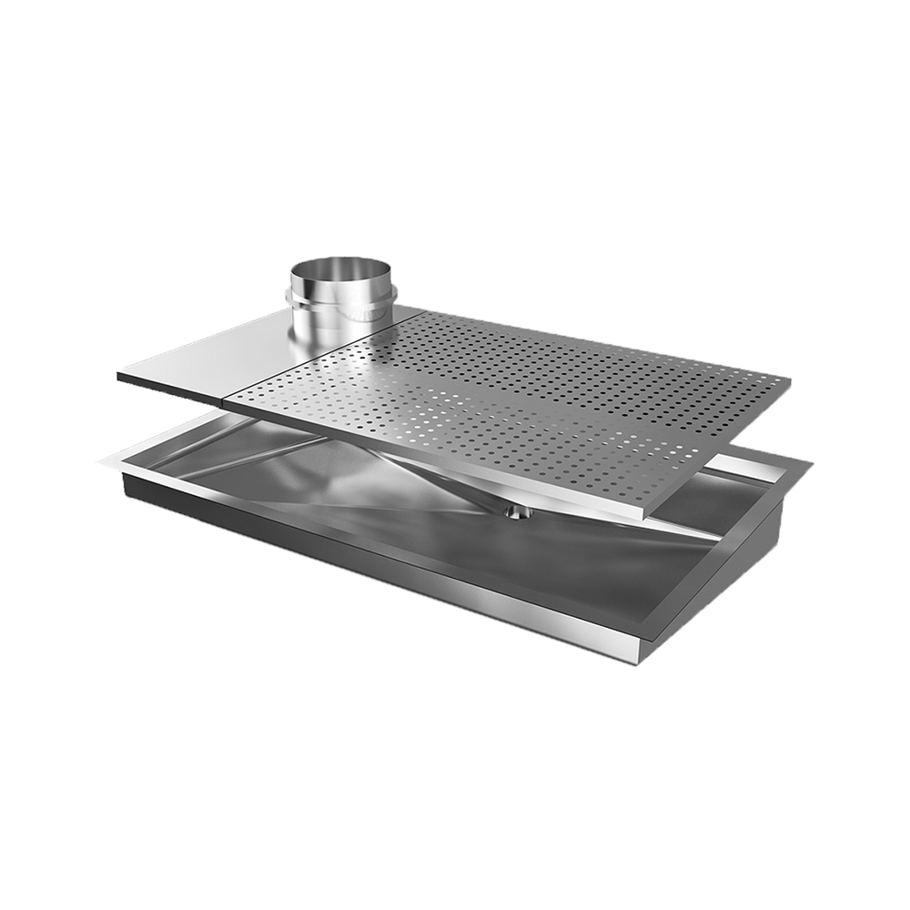 Rostfri syrafast frånluftskanal, Ø 160 mm. Standardlängd 1 m. Placeras antingen till vänster eller höger om den perforerade ytan.