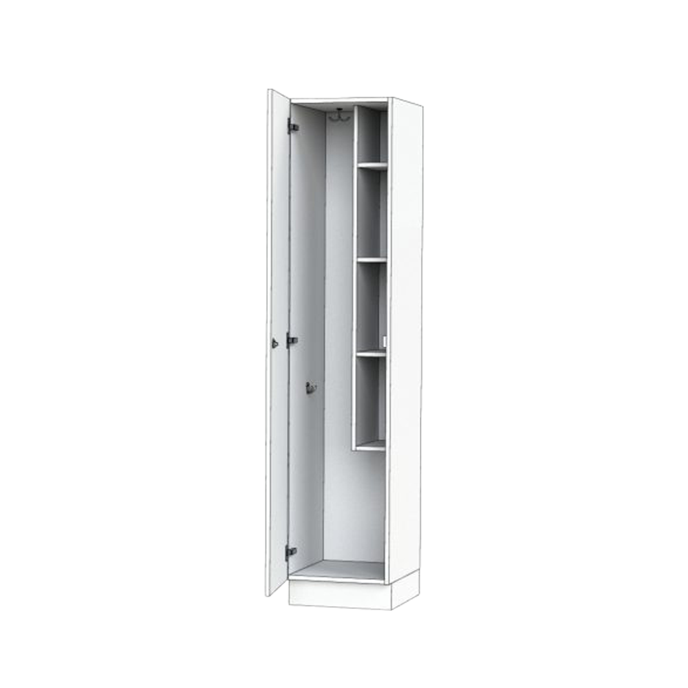 Luckor av 15 mm vattenfast högtryckslaminerad plywood alternativt 16 mm högtryckslaminerad spånskiva. Försedda med avhakningsskydd. Stomme av 15 mm vattenfast plywood belagd med högtryckslaminat alternativt 19 mm direktlaminerad spånskiva som tål det dagliga slitaget. Lås från ASSA skåplåssortiment.