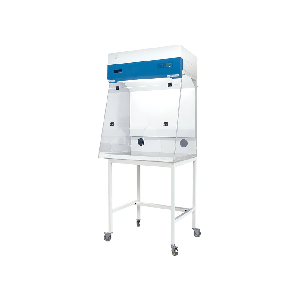 Huv i elektrogalvaniserat stål med vitlackerad epoxy-polyester Isocide™ antimikrobiell pulverbeläggning. Framdel med två öppningar för vardera arm. Frontluckan är tillverkad i 6 mm akrylplast och försedd med en tvådelad lucka. Luckan har 13° lutning för att minimera oönskad reflektion. Arbetsytan i skåpet tillverkas som standard i rostfritt stål.