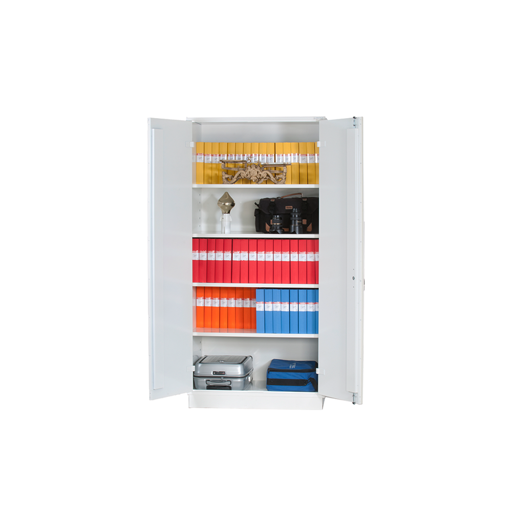 Handtagen är försedda med brytpunkt. Spärrar är svetsade på insidan av dörrarna på gångjärnssidan. Dörrarna är försedda med en förstärkningsprofil som i dörrarnas stängda läge ligger an mot hyllplanen. Skåpet är utrustat med kraftig spanjolettlåsning och cylinderlås. Flamsäker pulverlackering.