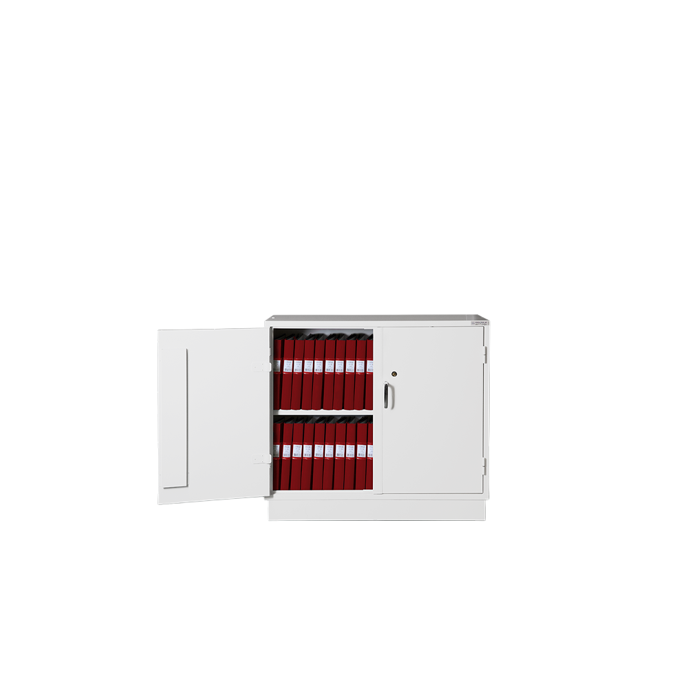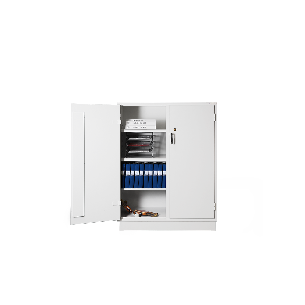 Förvaringsskåpet kan inredas med flyttbara hyllor, utdragbara hyllor samt utdragbara hängmappsramar.