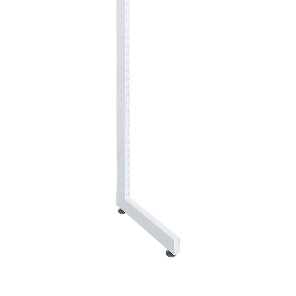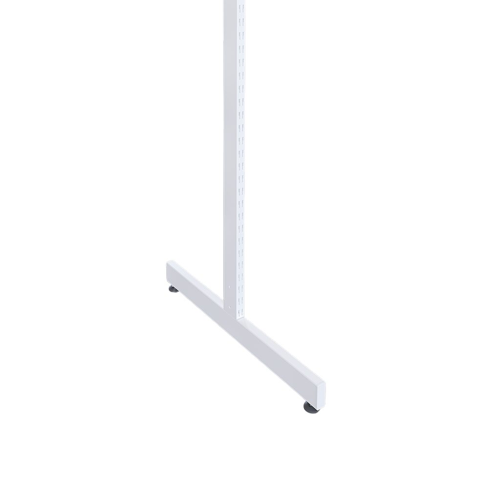 Stativ med fot levereras i samma djup som hyllplanen om inget annat önskas. Mellanstag monteras mellan L- och T-stativ.