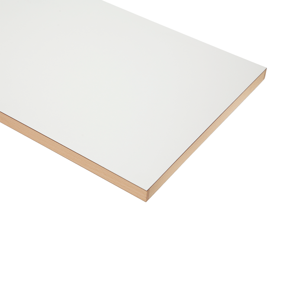 Hyllplan i 18 mm spånskiva belagd med högtryckslaminat. Överlaminerad klarlackerad massiv träkantslist runt om. Standard är högtryckslaminat, Alpino White F1040. Ange kulör, träslag och längd vid beställning. Maxlängd 3000 mm.