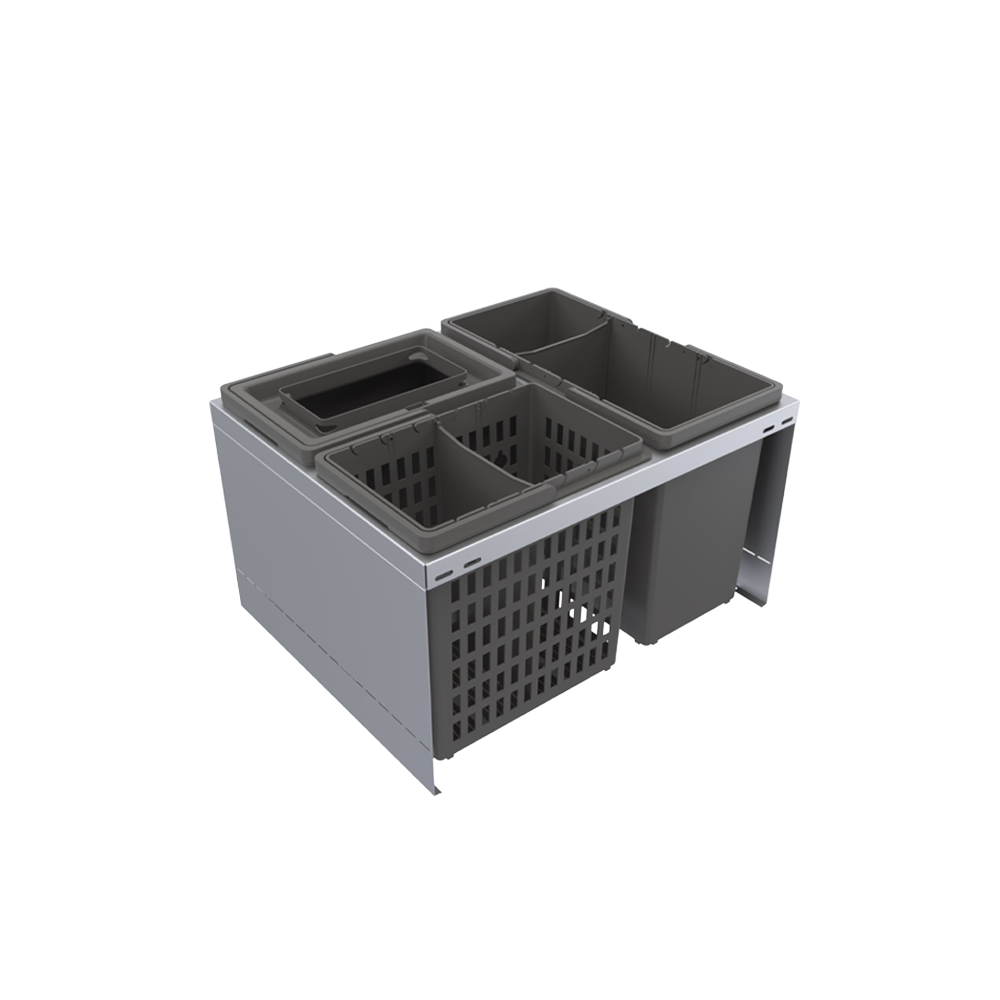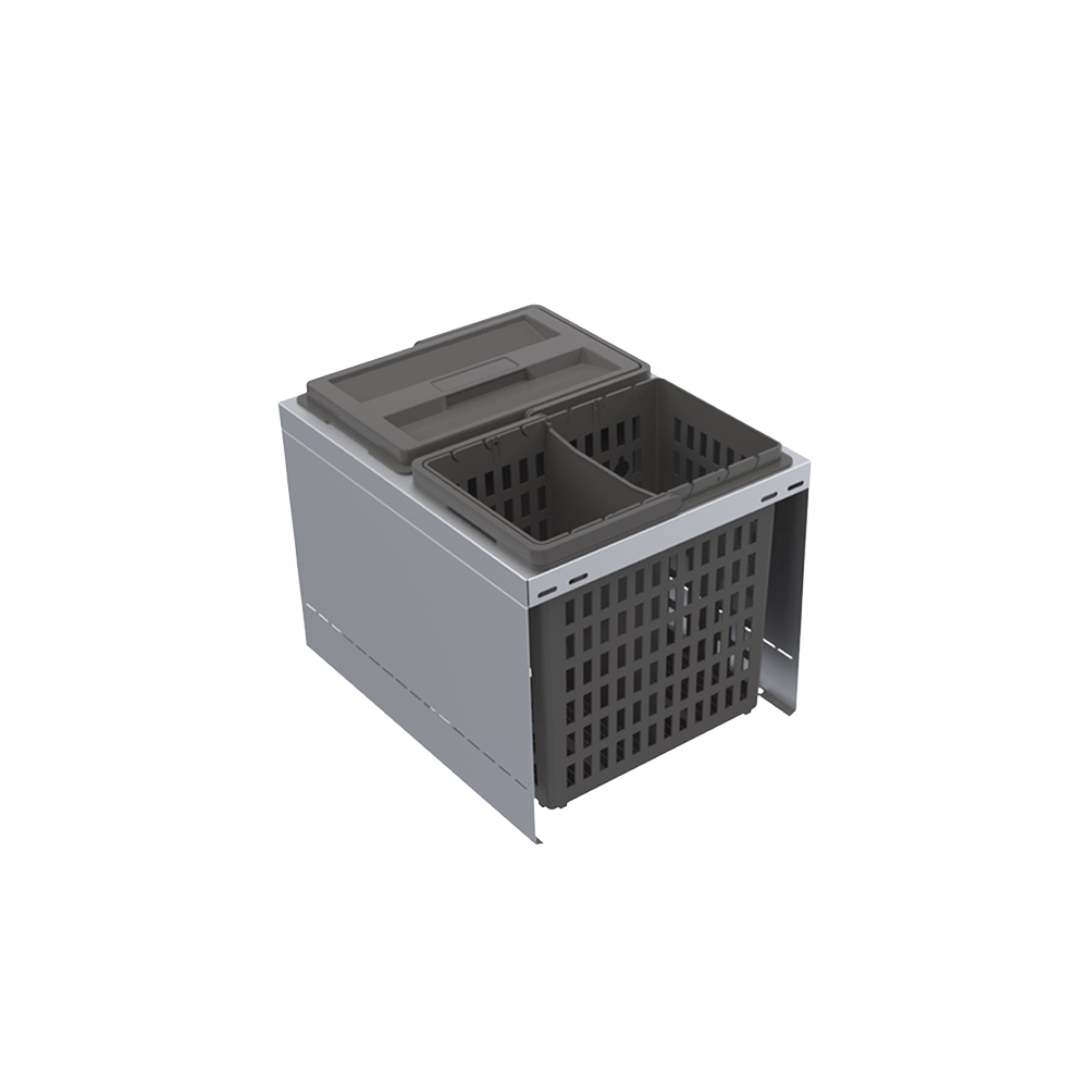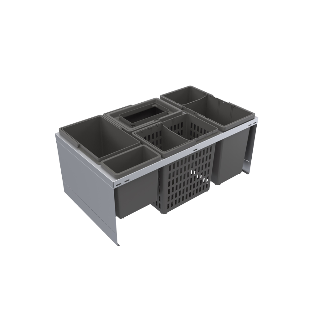 Källsorteringssats CUBE Eco passar bänkskåp i bredderna 400, 600 och 800 mm och 450 mm djup. Den monteras på botten av lådan och passar alla lådtyper med såväl raka som svängda lådsidor. CUBE Eco har heltäckande sidor av plåt vilket gör att den kan dela av en större låda. Hinkarna är tillverkade av återvunnen PET.