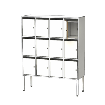 Stom- och luckutförande på lärarfackskåpen är standard direktlaminat, bok. Underrede utgörs av stålrör. Abloy-lås, individuell låsning.