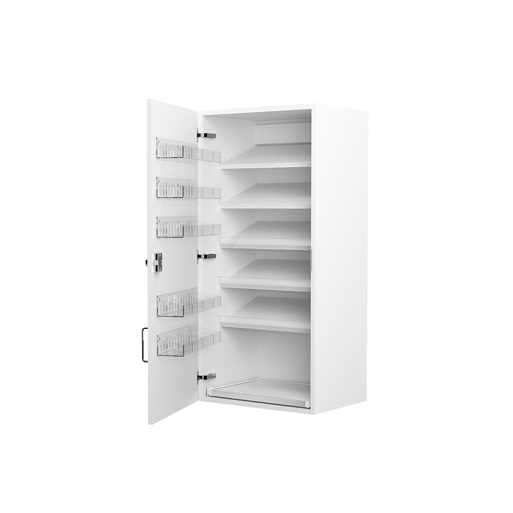 Stomme av 19 mm direktlaminerad spånskiva med kantlist av vit ABS. Lucka av 16 mm spånskiva belagd med högtryckslaminat och kant med Alu 3D kantlist. Rygg av vitlackerad board. Handtag medföljer ej som standard. Låshuset som medföljer är ett Assa 1596 och kan fås med huvudnyckelsystem. Kort och kodlås kan även fås på begäran.