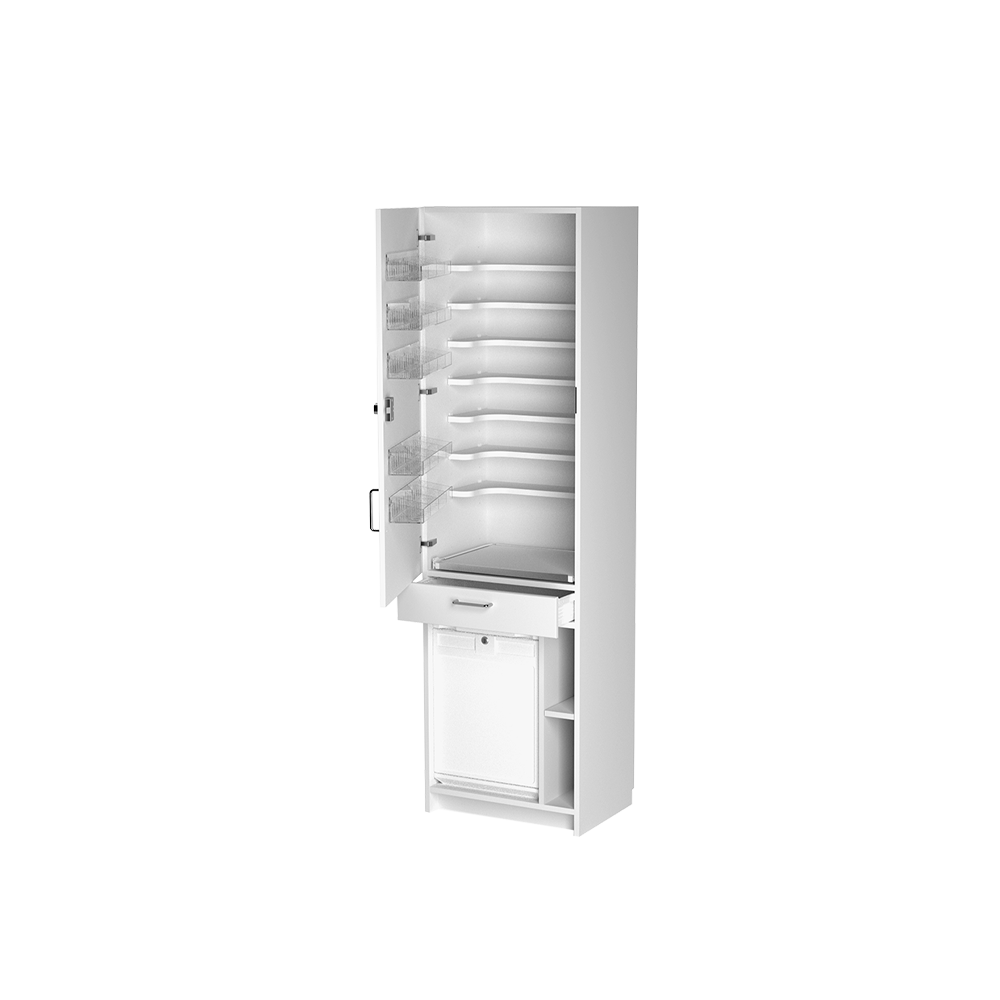 Stomme av 19 mm direktlaminerad spånskiva med kantlist av vit ABS. Lucka av 16 mm spånskiva belagd med högtryckslaminat och kant med Alu 3D kantlist. Rygg av vitlackerad board. Förberett för inbyggnad av medicinkylskåp DS-301H art.nr 11028. Handtag medföljer ej som standard. Låshuset som medföljer är ett Assa 1596 och kan fås med huvudnyckelsystem. Kort och kodlås kan även fås på begäran.