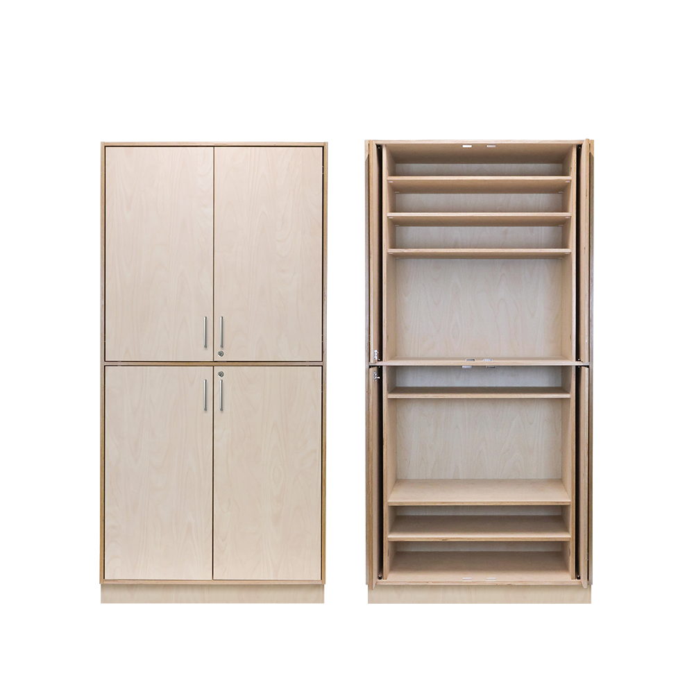 Robust förvaringsskåp med inredning och funktion specialanpassat för trä- och textilslöjdsalar i skolor. Tack vare Pocket Door-funktionen skjuts dörrarna enkelt in längs skåpets sidor och skapar en öppen och lättillgänglig förvaring utan svingande dörrar.
