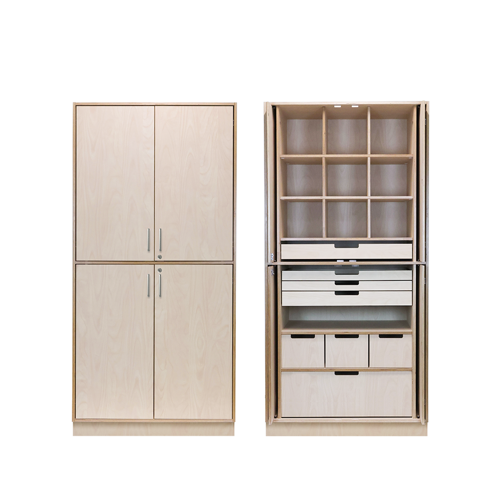Robust förvaringsskåp med inredning och funktion specialanpassat för trä- och textilslöjdsalar i skolor. Tack vare Pocket Door-funktionen skjuts dörrarna enkelt in längs skåpets sidor och skapar en öppen och lättillgänglig förvaring utan svingande dörrar.