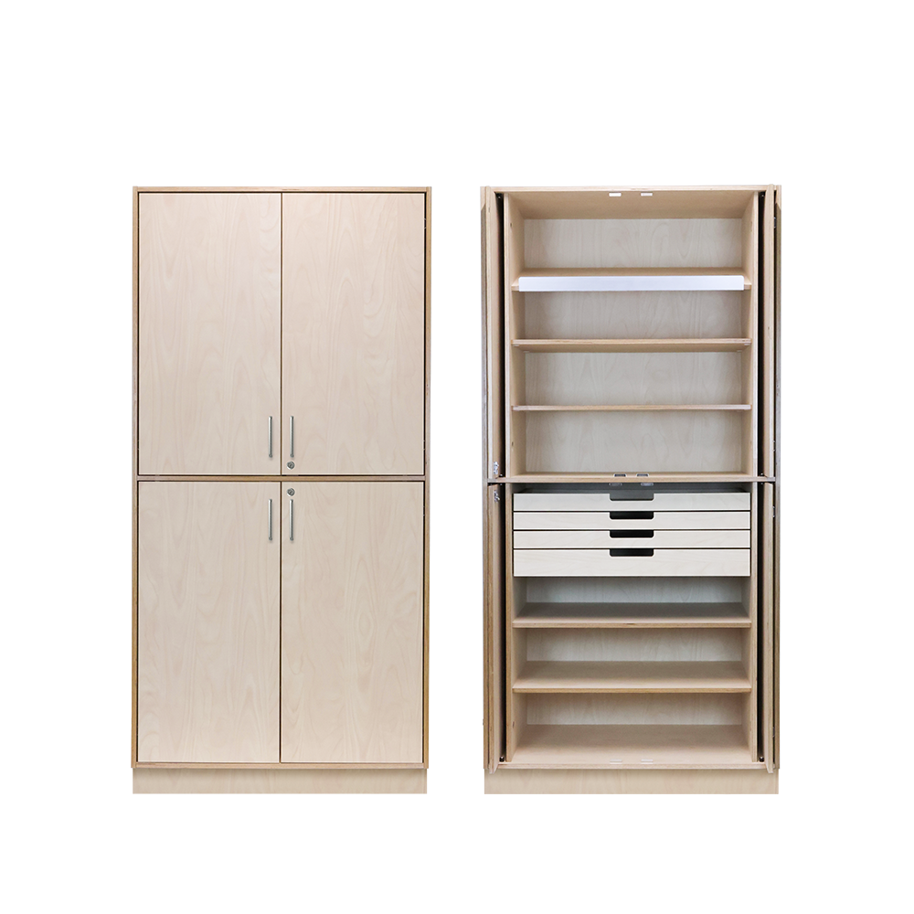 Robust förvaringsskåp med inredning och funktion specialanpassat för trä- och textilslöjdsalar i skolor. Tack vare Pocket Door-funktionen skjuts dörrarna enkelt in längs skåpets sidor och skapar en öppen och lättillgänglig förvaring utan svingande dörrar.